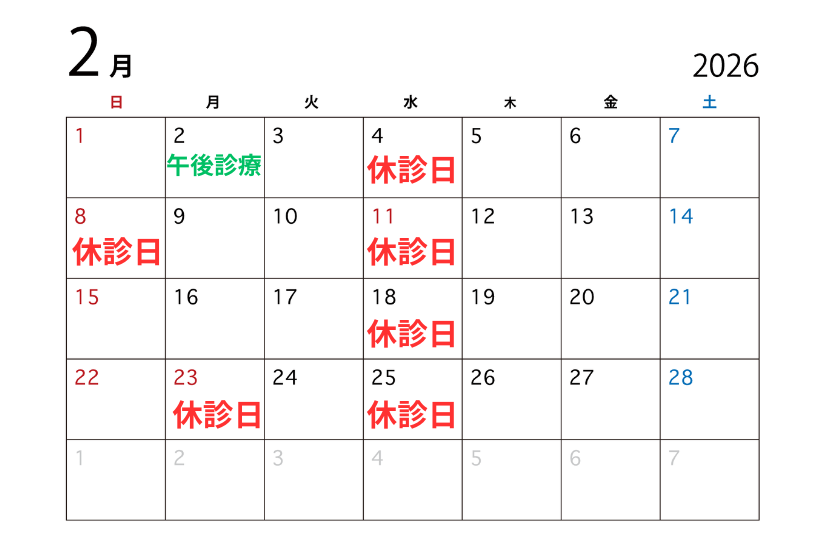 2月2日(月)全体研修の為、午後からの診療(15:30~20:00)となります。