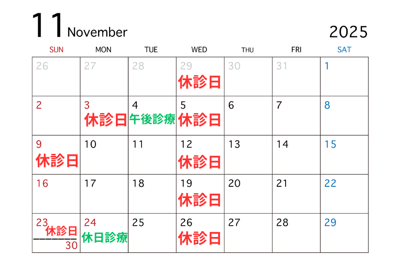 11月9日(日)は第二日曜日の為、終日休診となります。