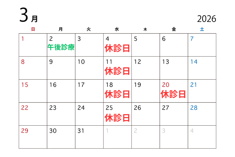 3月2日(月)全体研修の為、午後からの診療(15:30~20:00)となります。